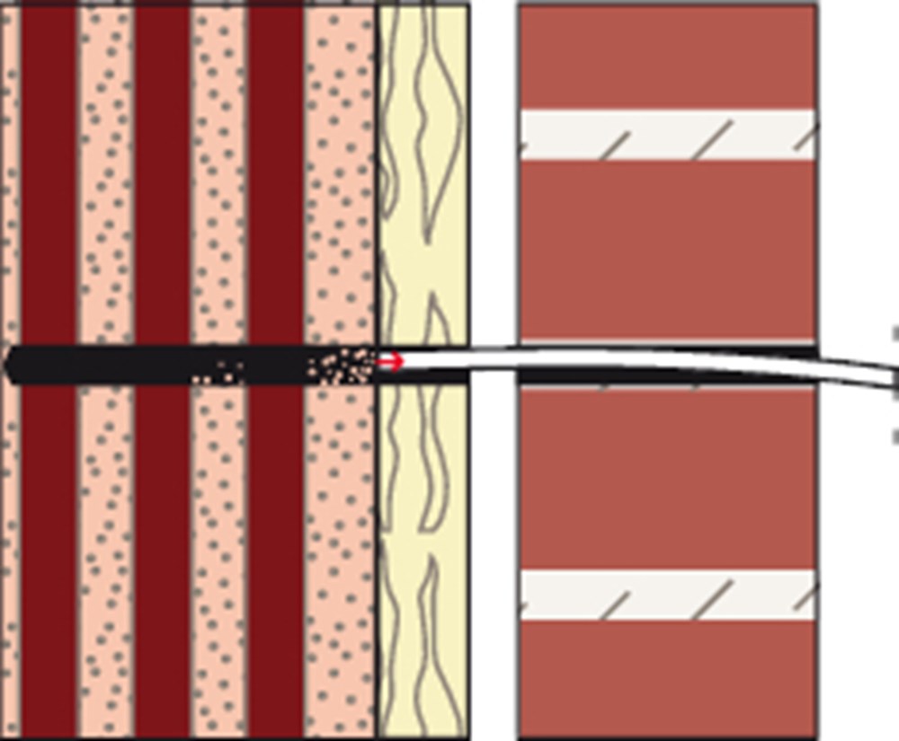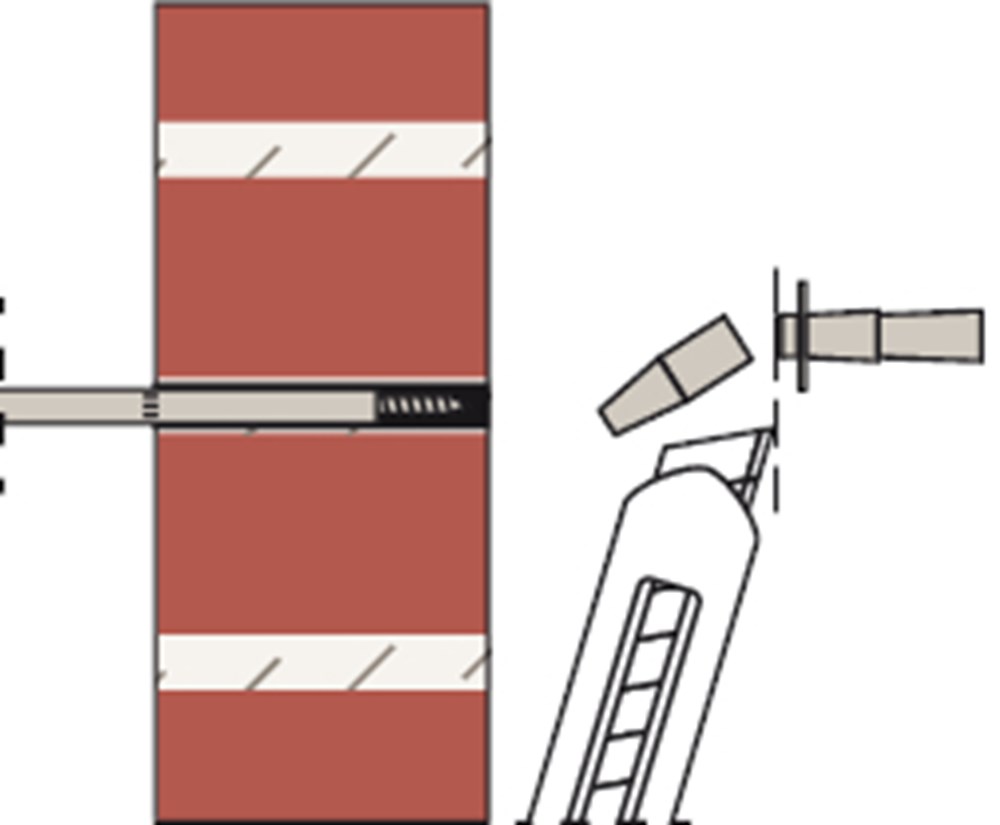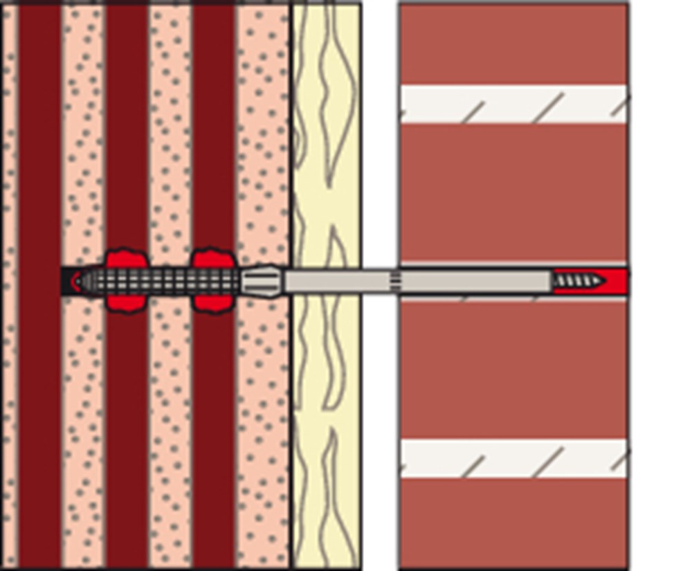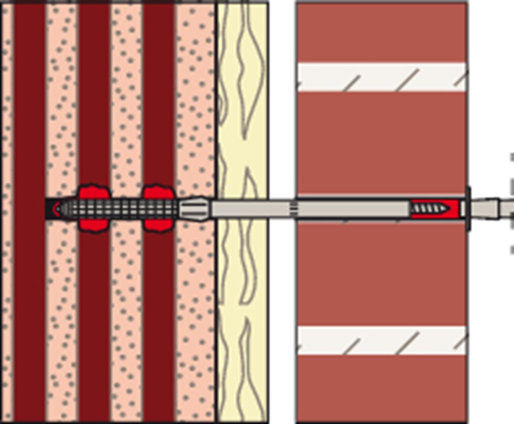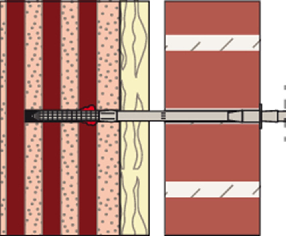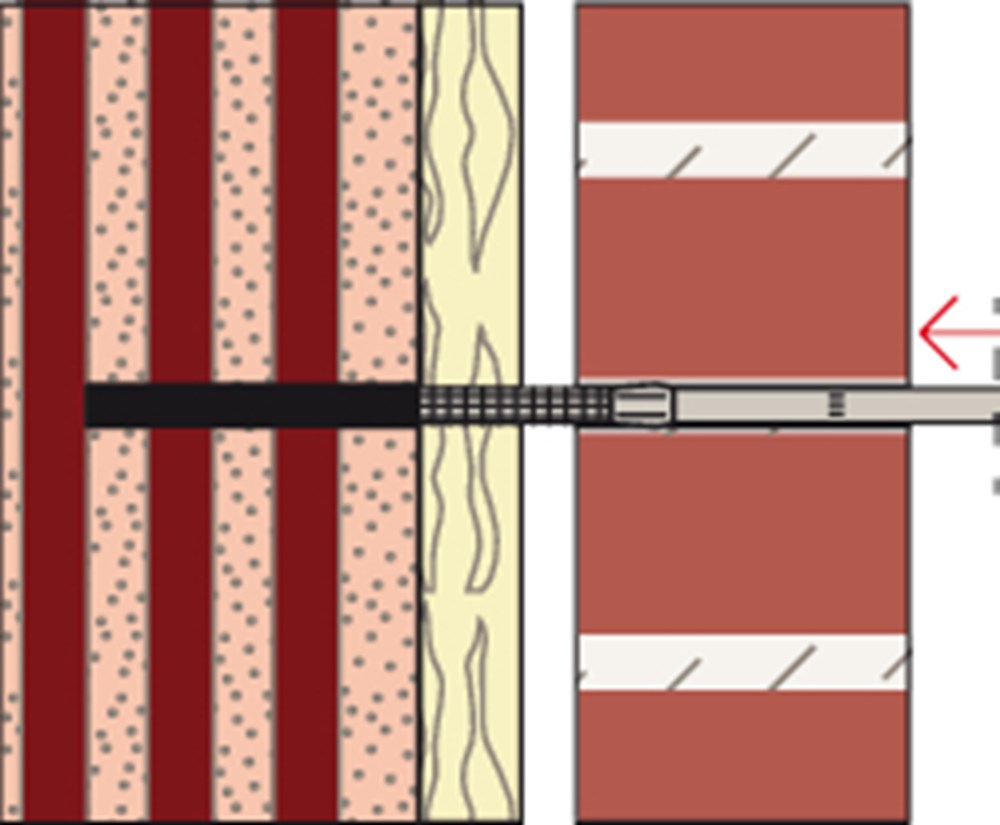 Het fischer Renovatieanker VBS8 is een goedgekeurd systeem voor een professionele gevelreparatie van gevels met en zonder luchtspouw. Het systeem bestaat uit de krachtige fischer Mortel FIS V, een injectiehuls van kunststof en profieldraad van roestvast staal. De VBS8 wordt in de doorsteekmontage in de voeg van de voorste gemetselde muur geplaatst. De ankerhuls wordt in het boorgat gestoken. Daarna wordt de mortel geïnjecteerd, die het 4 mm draadanker spreiddrukvrij in de draagmuur en in de voorste muur verankert.