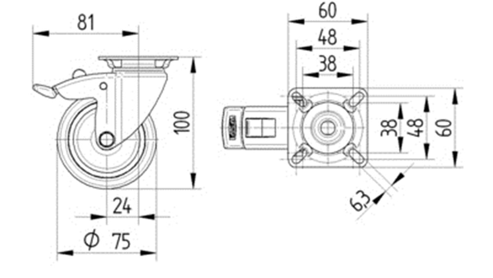 Zwenkwiel met dubbele rem, vork van roestvrij staal, met dubbele kogeldraaikrans in de zwenkkop, wielas geschroefd, verchroomd zink-gietwerk rempedaal, plaatbevestiging. Wielkern van polypropyleen met grijze niet-strepende TENTEprene thermoplastische rubberband, wielnaaf op glijlager