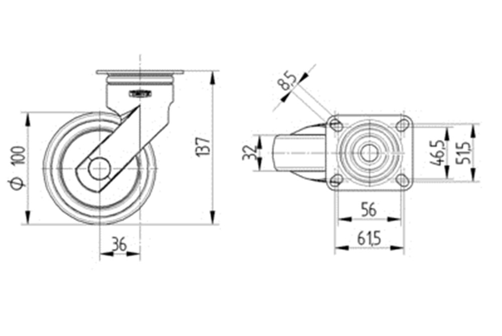 Zwenkwiel, vork en wiel van hoogwaardig synthetisch materiaal, zwenklager met dubbele kogeldraaikrans, plaatbevestiging. Wielkern van polypropyleen met grijze niet-strepende TENTEprene thermoplastische rubberband, wielnaaf op precisiekogellager, met afdekkappen