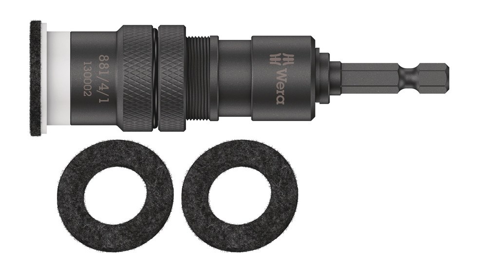 Bij de aanleg van terrassen moeten de schroeven zover worden verzonken dat de bovenkant daarvan gelijk ligt met de bovenkant van het houten terrasdeel. De 889/4/1 bit-handhouder met variabele schroefdiepte instelling en viltring garandeert een gelijkmatige inschroefdiepte en voorkomt beschadiging van het oppervlak.