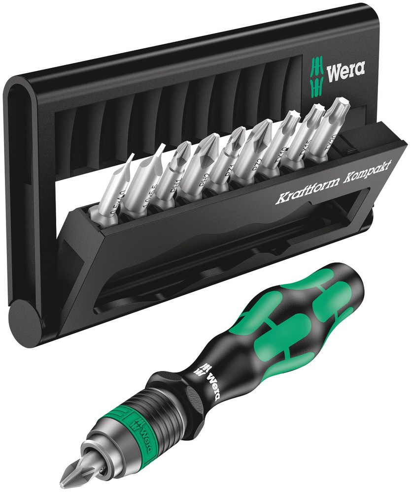 9 extreem harde Wera bits, voor universeel gebruik. Torsievorm om voortijdige slijtage te voorkomen. 1 handhouder 813 Kraftform met snelwisselfunctie ‘Rapidaptor’, meerdelig voor snel en uiterst ergonomisch verantwoord schroeven.