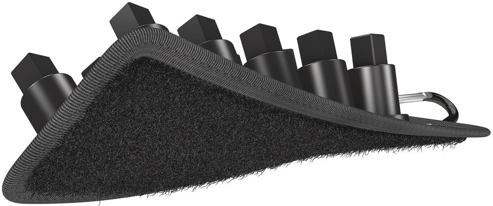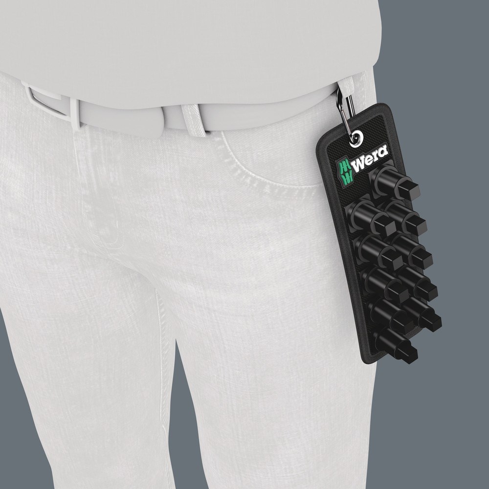 Robuuste stoffen riem (belt) in karakteristiek Wera design voor max. 10 VDE bit-doppen en dit alles uiterst compact. Een soepel werkend draaimechanisme maakt veilig opbergen en makkelijk verwijderen van de doppen mogelijk. Inclusief karabijnhaak voor bevestiging aan broekriemlus of tassen. Achterzijde van vliesstof en klittenbandsegment voor eenvoudige bevestiging aan bijvoorbeeld wanden, rekken, gereedschapswagens en het gereedschapstransportsysteem Wera 2go.