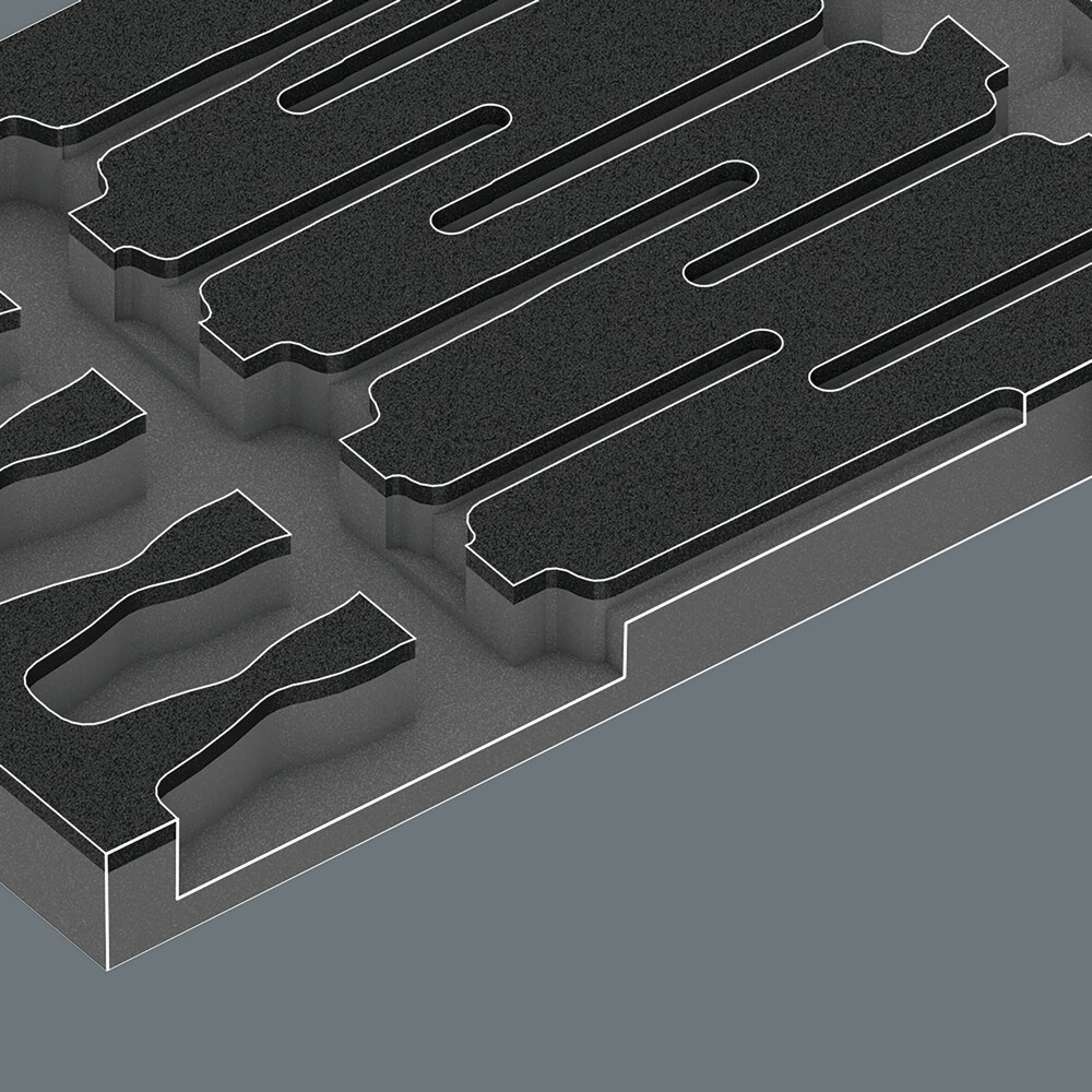 Duurzaam schuimrubberen inzetstuk; 2-kleurig om ontbrekende onderdelen snel te herkennen; geschikt voor de Tool Rebel werkplaatswagen; compleet uitgerust met 14 Wera Kraftform VDE schroevendraaiers en 2 schroefklauwen.