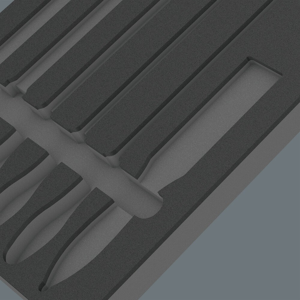 1 duurzaam schuimrubberen inzetstuk, zonder gereedschap; 2-kleurig om ontbrekende onderdelen snel te herkennen; breedte x hoogte x diepte: 344 x 30 x 392 mm; vervangend schuimrubberen inzetstuk voor Wera artikel 9783; geschikt voor de Tool Rebel werkplaatswagen.