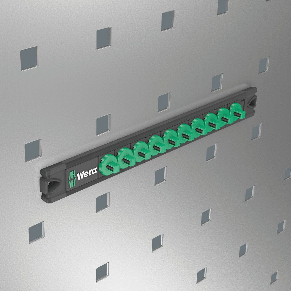 1 dop-magneetstrip, leeg. Voor max. 10 doppen en/of bit-doppen met 1/4″ aandrijving. De magneetstrip maakt tijdelijke bevestiging aan metalen oppervlakken mogelijk en beschikt dankzij de ‘twist-to-unlock’ functie over een veilige dopvergrendeling en -ontgrendeling.