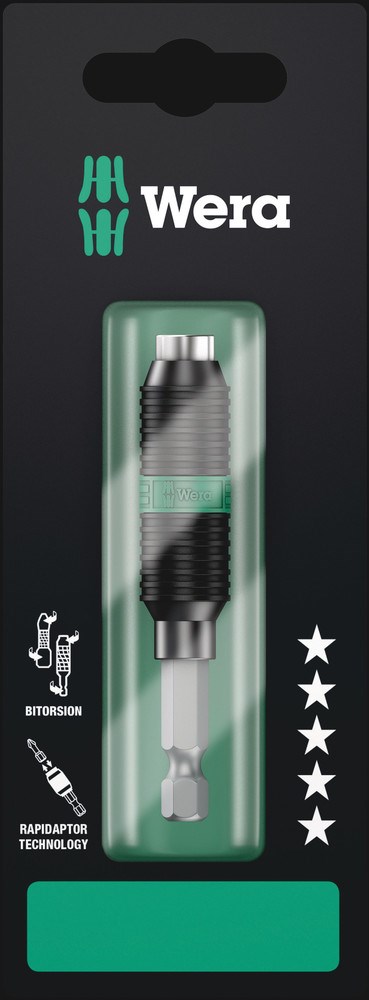 Universele houder geschikt voor plaatsing van bits met 1/4″ buitenzeskant-aandrijving conform DIN ISO 1173-C 6,3 en E 6,3 (ISO 1173). BiTorsion-houders van Wera zijn voorzien van een torsieveer die kleine belastingspieken tijdens het schroeven afleidt. De combinatie van BiTorsion-bits en de torsiezone verlengt de levensduur van het gereedschap aanzienlijk. In BiTorsion-houders van Wera kunnen ook conventionele bits worden gebruikt. Dankzij de Rapidaptor-technologie kunnen bits worden geplaatst zonder daartoe de huls te moeten bedienen. Om de bits weer te verwijderen, hoeft u de huls slechts naar voren te schuiven – zo kunt u bits zelfs met 1 hand razendsnel wisselen. 1/4″ zeskant, passend in schroefmachines met opname conform DIN ISO 1173-F 6,3.